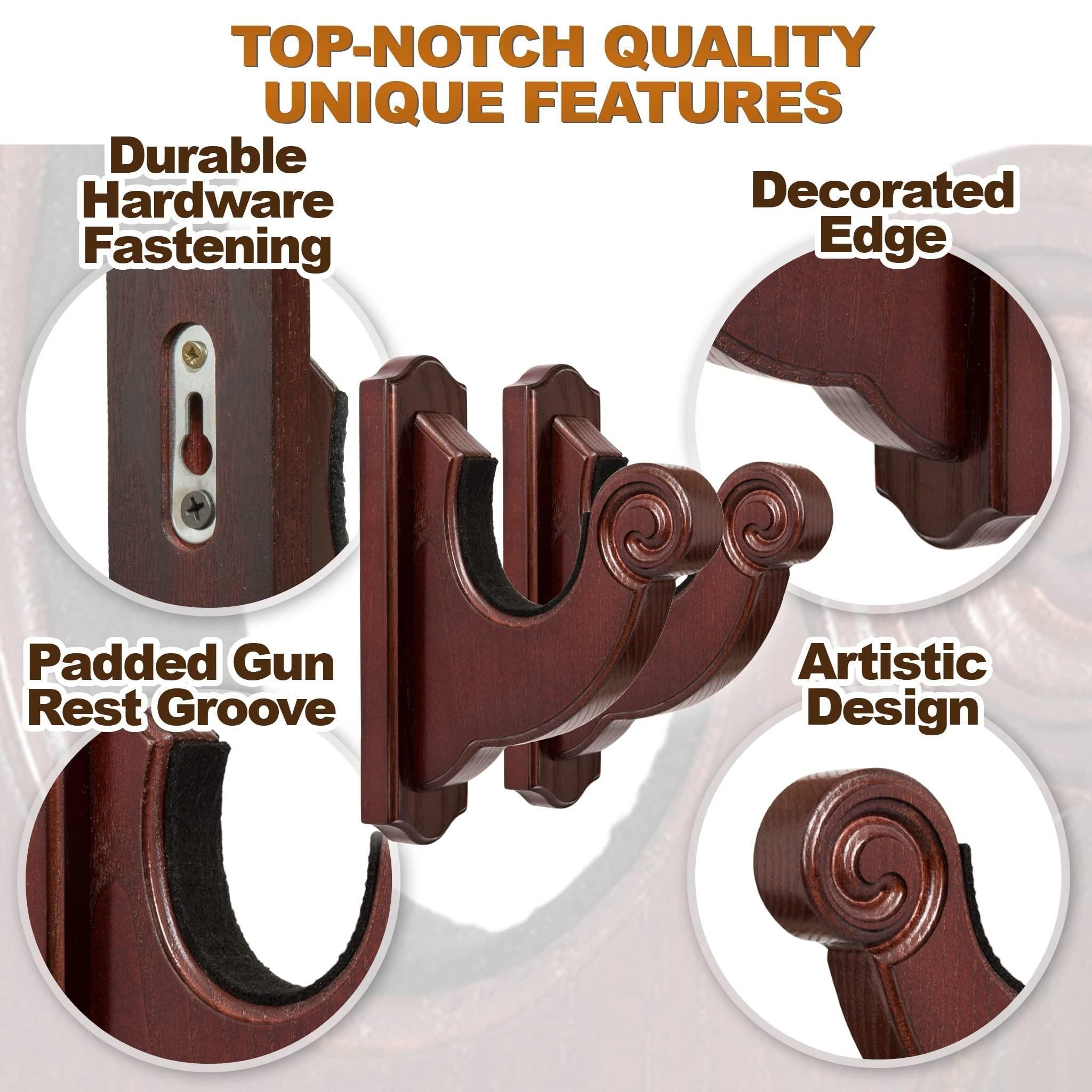 3.[real hardwood] its made of solid wood with finish that protects it from water and moisture damage while preserving its natural beauty. hooks are covered with felt for fixation and to give your gun the protection it deserves.