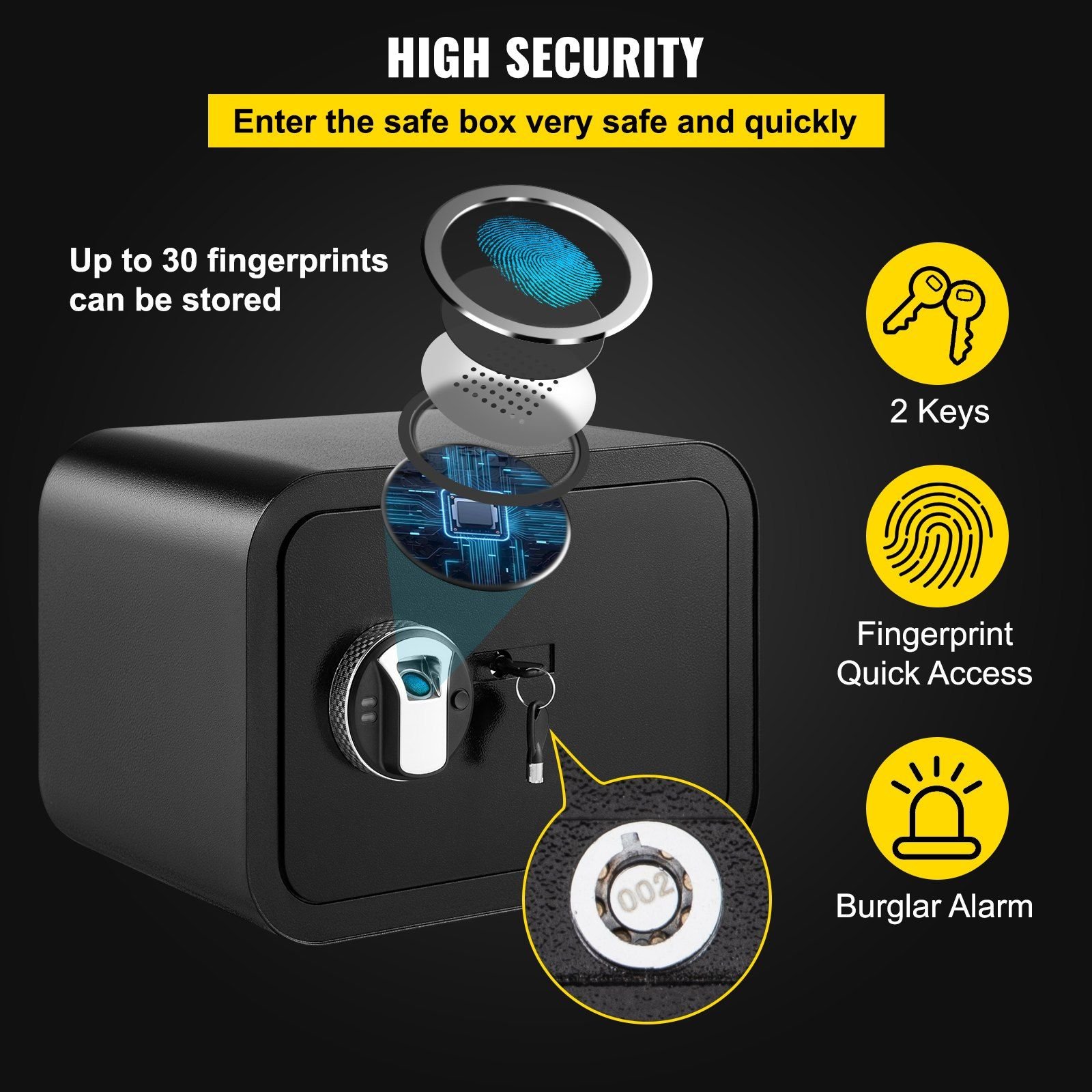 This security safe has 2 unlocking methods available. You can use the provided keys or fingerprint scanner to unlock the door. Furthermore, this security safe can store up to 30 fingerprints, meeting various accessibility demands.