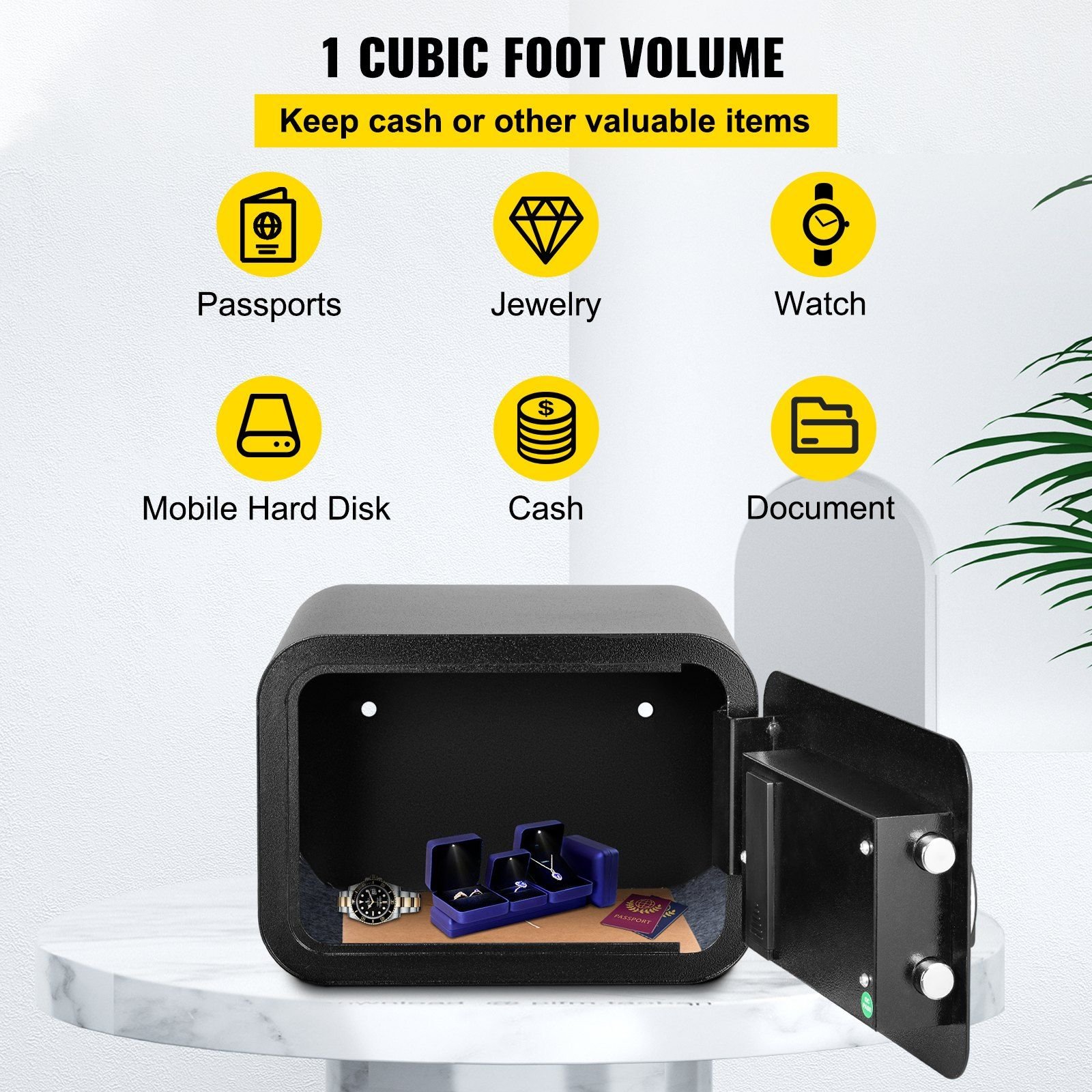 This safety box features a 1 cubic foot storage capacity and multiple reliable lock systems. You can securely and quickly access the safe with a key or fingerprint. It also has solid steel boards, and an internal soft carpet to help protect all of your valuables and maintain their mint condition. The black safe also has pre-drilled mounting holes in the back to mount on the wall. Don't fall victim to petty theft, prevent it with a name you can trust, VEVOR.