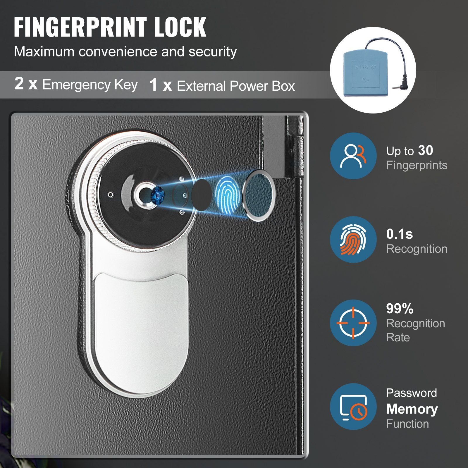 1.Smart Fingerprint Lock: VEVOR long gun safe features a smart fingerprint lock for quick and secure access in just one second. You can register up to 30 fingerprints for easy access. In case of emergency, the safe also includes two emergency keys and an external charging box, so you never have to worry about the battery running out.