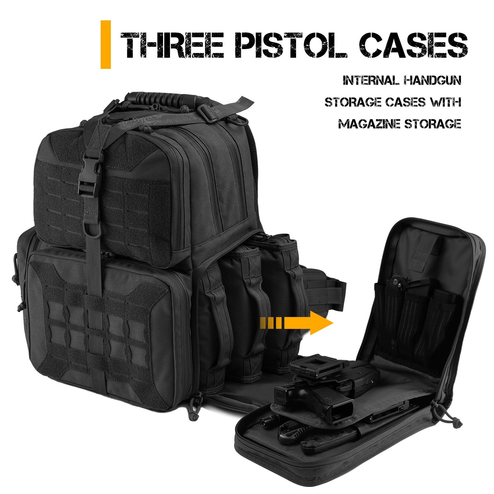 Multifunctional Professional Range Bag: VOTAGOO range backpack can hold 3 pistols of different size and magazines. Large capacity space can be used to carry all tactical accessories you need such as sabers; flashlights; shooting goggles; shooting earmuff; gloves; etc.Durable Design With 1000D Nylon: This Tactical range bag is made of 1000D polyester fabric; sturdy; water-resistant; durable; suitable for tactical range activity and outdoor shooting or hunting. Three removable pistol cases built-in sponges can protect guns and ammo more effective; avoid wear and tear.Comfortable & Portable: Professional breathable & ergonomic thicker padded design on the back make you sweat-proof and comfortable. Lockable compartment make your firearms more safe and avoid unnecessary troubles. Thoroughly design will fulfill your range day needs.Stylish & Upgrade Dimension: The Size of this range backpack is L14' x W10' x H17'. Built-in backpack rain cover can handle any weather without worrying about your backpack getting dirty. Customizable web can make your backpack more personalized.VOTAGOO After-sale Service: VOTAGOO has been committed to the R&D and production of tactical equipment. We offer 180-day warranty. Please contact us feel free; we are always here to help.