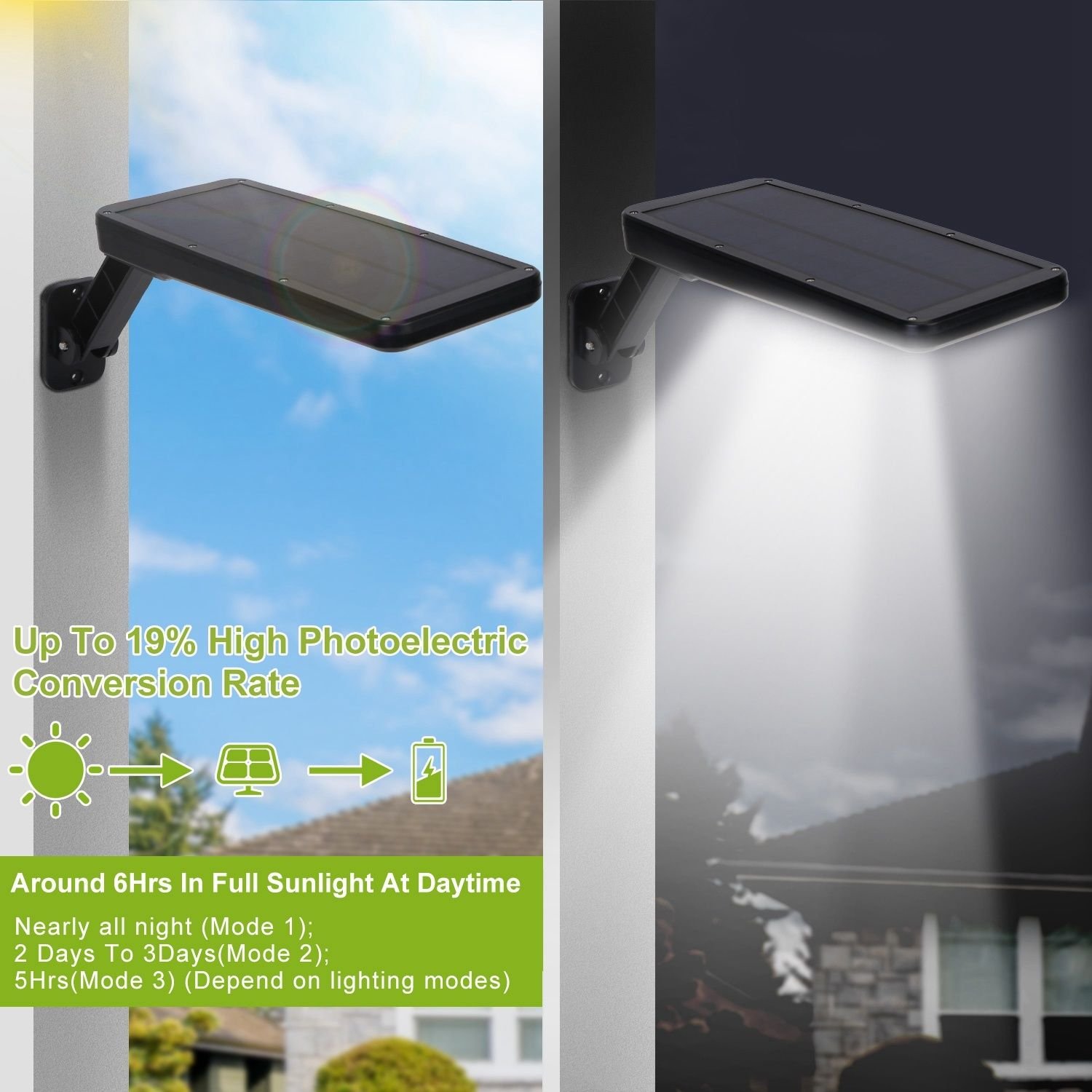 **Up To 3 Days Runtime*:Its solar panel with high photoelectric conversion can effectively absorb the sunlight on the day and convert sunlight into electricity to fully charge the inbuilt 2Pcs 2200mAh battery about 6 hours. Sustain up to 3days runtime according to different lighting modes. The wall LED lighting is specially designed with 180 degrees rotatable; so that you can adjust the solar panel angle for the best daylight exposure.
